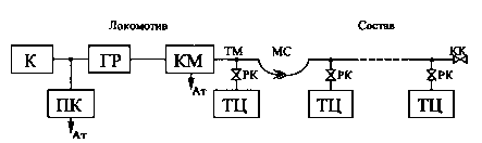 Впервые сжатый воздух для торможения подвижного состава был применен в прямодействующем неавтоматическом тормозе в 1869 г. Данный тормоз состоит из компрессора (К), предохранительного клапана (ПК), главного резервуара (ГР), крана машиниста (КМ), тормозных цилиндров (ТЦ), тормозной магистрали (ТМ), межвагонных соединений (МС), концевого (КК) и разобщительного крана (РК) (рис. 2.1).