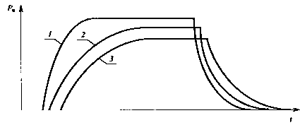 Рис. 2.2. Диаграммы изменения давления в ТЦ в прямодействующем неавтоматическом тормозе: 1 — головной вагон, 2 — средний вагон, 3 — последний вагон