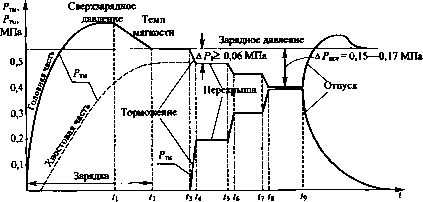 Для ускорения зарядки тормозов составов в парках отправления и их отпуска после очередных торможений используют так называемое сверхзарядное давление, которое на 0,05—0,10 МПа больше установленного. При этом выдерживают такой временной интервал для повышенного уровня давления в ТМ, который пропорционален длине состава (до момента ^), а затем снижают его темпом мягкости (период * |—*2)>На который не реагируют ВР, переходя на зарядное давление.