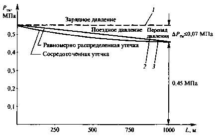 Рис. 2.5. Изменение давления в тормозной магистрали при утечках: / — зарядное давление, 2 — поездное давление при равномерно распределенной утечке в ТМ, 3 — поездное давление при сосредоточенной утечке в ТМ
