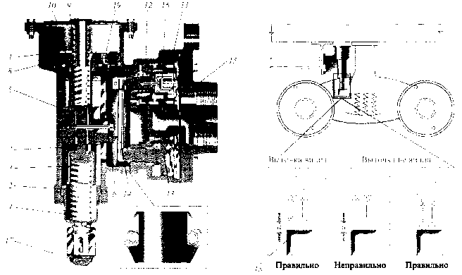 При увеличении загрузки вагона (рис. 6.5) растет прогиб его рессорного подвешивания и плитой 18 упор 17 перемещается вместе с сухарем 6 и поршнем 8 вверх по отношению к реле давления, изменяя соотношение плеч рычага 14. Колебания кузова вагона при движении вызывают перемещения вилки 2 в корпусе 1 и изменение усилий пружин 4 и 9, которые передаются на поршень 8. Последний демпфирует указанные колебания путем перепуска воздуха через калиброванное отверстие 19 диаметром 0,4 мм из верхней полости в нижнюю, и наоборот. Это обеспечивает практически неизменное положение сухаря 6 на рычаге 14 в режиме отпуска с перемещениями не более чем ±1 мм при амплитуде колебаний кузова 15—20 мм. В заторможенном положении сухарь 6 прижимается усилием рычага 14, и его перемещения исключаются. У порожнего вагона, когда канавка на вилке 2 АР выходит из корпуса 1 демпферной части, между упором 17 и плитой 18 допускается зазор до 5 мм.