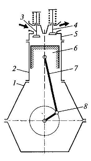 1 — картер; 2 — цилиндр; 3 — клапан впуска; 4 — клапан выпуска; 5 — крышка цилиндра; 6 — поршень; 7 — шатун; 8 — коленчатый вал