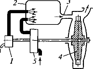 1 — топливный насос; 2 — камера сгорания; 3 — направляющий аппарат; 4 — турбина; 5 — компрессор