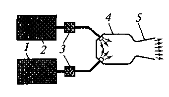 / — емкость для топлива; 2 — емкость для окислителя; 3 — насосы; 4 — камера сгорания; 5 — сопло