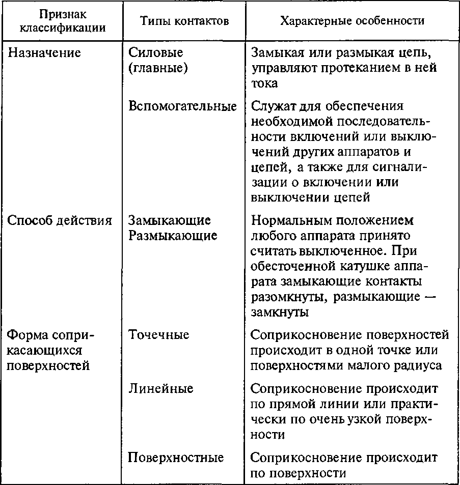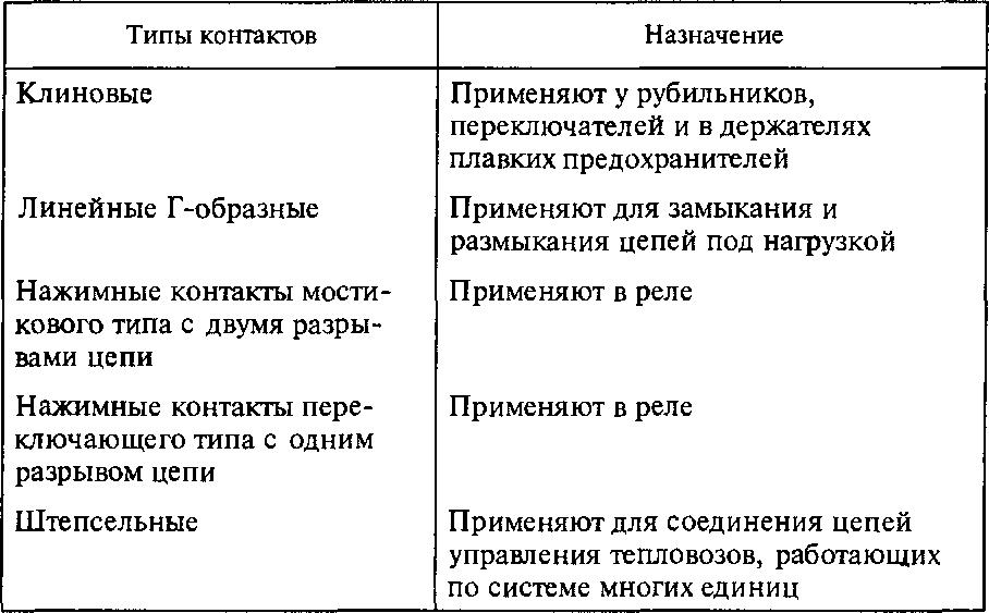 На рис. 12.2 показаны различные формы соприкасающихся поверхностей контактов. В табл. 12.2 представлены различные контакты, применяемые в аппаратах тепловозов.