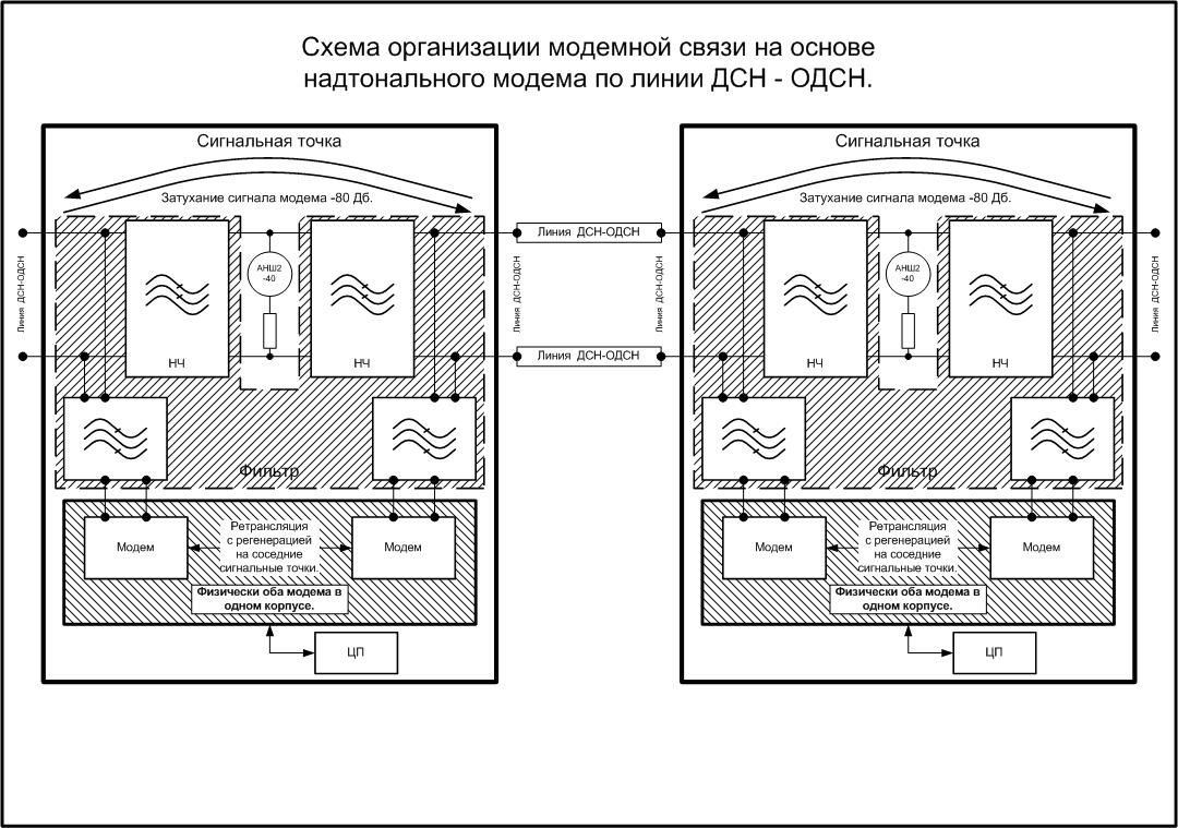 Там есть два варианта модемов. Один из них надтональный спаренный модем с несущей частотой 26 кГц с фильтрами для возможности использования линии связи по её основным функциям АБ. АКСТ занимает то же частотный диапазон, что и классическая ЧДК, то есть тональный с частотами до 3 кГц. Более того, модем прекрасно работает, если по линии протекает ток от источника ~220в.