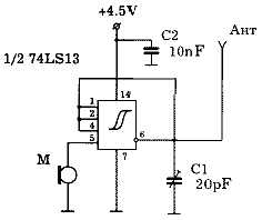 На рисунке показана схема ЧМ-передатчика, который выполнен на элементе ТТЛ 4И-НЕ, три логических входа которого заведены на нагруженный ёмкостью выход и обеспечивают самовозбуждение, а четвёртый питает и одновременно снимает звуковое напряжение с электретного микрофона, обеспечивая частотную модуляцию несущей. Устройство работает в диапазоне 80-100 МГц, частота настройки регулируется подстроечным конденсатором C1. Антенной служит отрезок медного провода длиной 15 см. ![]() |