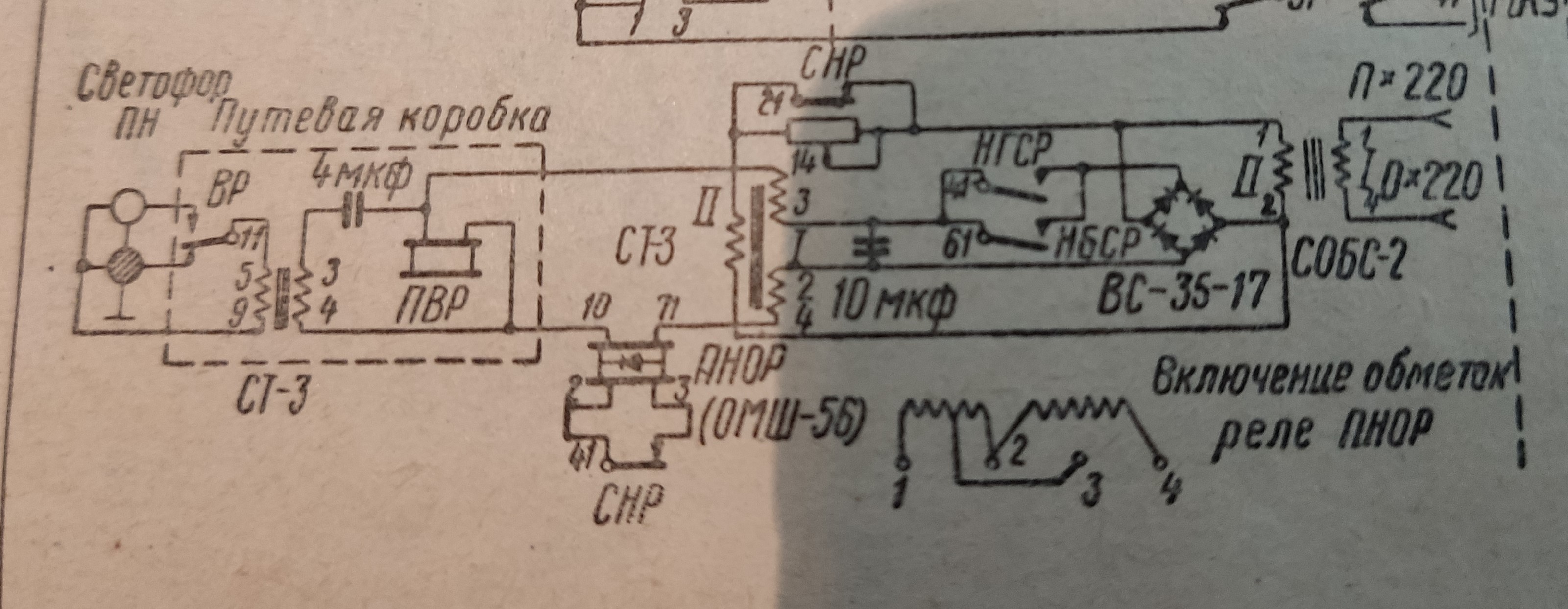 Поделюсь здесь двухпроводной схемой управления предупредительным линзовым светофором из книги "Системы путевой полуавтоматической блокировки РПБ и БПЛЦ". Интересна схема тем, что реле переключающее показание светофора "ПВР" находится в путевой коробке возле светофора, а по двум проводам одновременно протекает переменный ток для лампочки и постоянный ток для реле. Кто-то мне рассказывал, что к предупредительному светофору у них уложен кабель четвёрка. 2 жили - прожекторный светофор и 2 жилы - РЦ, запаса нет. Там бы эта схема помогла бы перейти с прожекторного на линзовый светофор, пока не уложат кабель нормальной ёмкости.