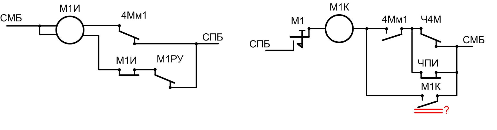 Фишка в том, что данный светофор стоит в непосредственной близости к переезду и открывается с замедлением в 45с. Исключающее реле М1И обесточится только после открытия светофора М1, т.е. через 45с. А на протяжении 45 секунд своим фронтовым контактом реле М1И сохраняет цепь возбуждения реле ЧПМ для открытия входного светофора "Ч". И если нажать в это время кнопку открытия входного светофора, то сработает реле ЧПМ, зашунтирует своим контактом контакт исключающего реле М1И в цепи своего срабатывания и светофор "Ч" будет стоять открытым и после открытия светофора М1. На схеме 4Мм1 - это контакты маршрутного реле маршрута от светофора М1 на путь № 4.