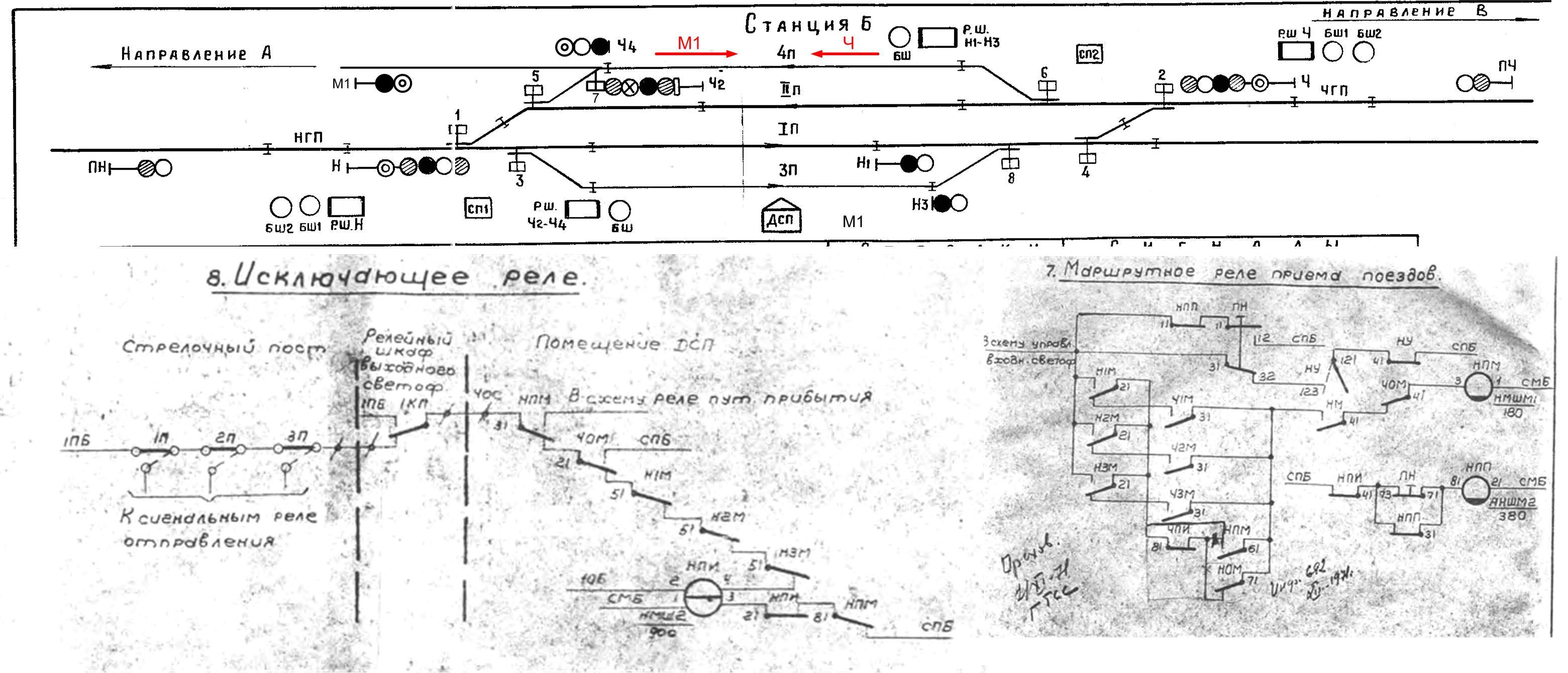 Есть станция по РПБ-4 к которой примыкают подъездные пути. Со стороны подъездных путей станция ограждена маневровыми светофорами. В типовом альбоме РПБ-4 нет схем управления такими светофорами((( А интересует схема исключения задания лобовых маршрутов на приемоотправочный путь от такого маневрового светофора и от входного светофора противоположной горловины. Например, как показано на рисунке ниже, от светофора "М1" и от входного "Ч" на путь №4. Ниже привожу с альбома РПБ-4 схему исключающего реле для входного светофора "Н". Для маневрового светофора должна быть тоже схема исключающего реле, контакты которого вводятся в схему приемомаршрутного реле Н(Ч)ПМ. У кого есть схема управления маневровым светофором при РПБ-4, в частности схема исключающего реле, просьба поделиться схемкой. К действующей на станции схеме есть вопросы и хочется сравнить данную схему со схемой другой станции.