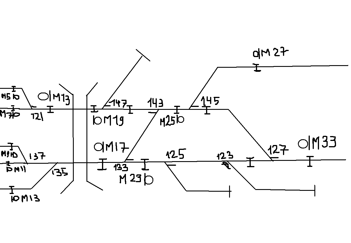 вообщем такая "проблемка". при наборе маршрута от м33 за М5(М7) после прохода поезда остается белая полоса маршрута от М33 до М13. такая же ерунда при задании от м33 за М9(М11,М13) остается белая полоса от м33 до м 17. система БМРЦ схему прилагаю, заранее спасибо. и секции как говорят ДСП ведут себя нормально, не загораются,не моргают.