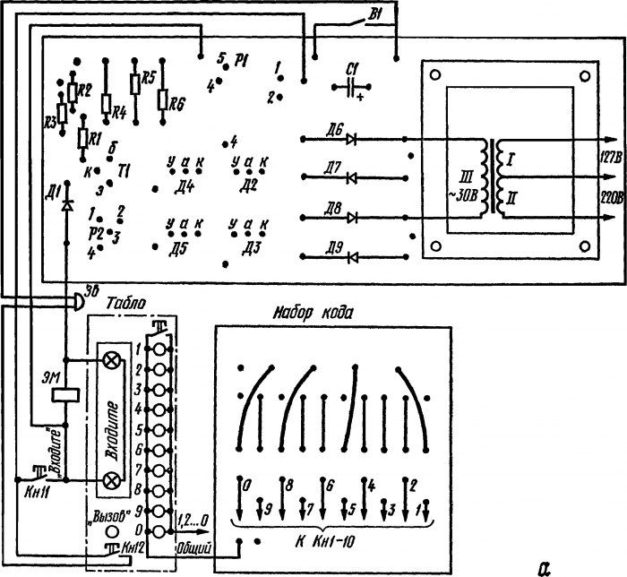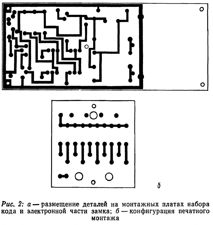 Тема: Кодовый замокКодовый замок В. Кравцов Кодовый замок, принципиальная схема которого показана на рис. 1, предназначен для установки в дверях квартир, складов, сейфов, а также для охраны автомашин. Напряжение источника питания может быть следующим: 12,6 В постоянного напряжения (автомобильный вариант), 36 В переменного или постоянного напряжения, сеть переменного напряжения 127/220 В. ![]() Замок срабатывает при нажатии кнопок только в определенной, заданной кодом последовательности. Код четырехзначный, а общее количество кнопок — десять, что значительно уменьшает вероятность подбора кода. В данном варианте на принципиальной и монтажной схемах показан условный код «1580». Для того чтобы исключить возможность открытия замка подбором кода, свободные кнопки, не использованные для кодирования, соединены параллельно и подключены через резистор R2 к базе транзистора 77, который заперт отрицательным напряжением, подаваемым через резистор R1. Нажатие одной из этих кнопок открывает транзистор 77, в цепи эмиттера которого включено реле Р2. Реле срабатывает и своими контактами Р2/1 разрывает цепь питания тиристоров Д2—Д5. Все тиристоры закрываются независимо от числа правильно и неправильно набранных цифр кода. Такой же результат будет при нажатии всех десяти кнопок пульта, чему способствует большой разброс хода применяемых кнопок, затрудняющий открывание замка при незнании кода. ![]() В случае правильного набора кода срабатывает реле Р1, своими контактами Р1/1 включает тяговый электромагнит Эм1 и подает напряжение на лампы Л1 и JI2, освещающие надпись «Входите». При открывании двери контакты концевого выключателя В1 разрывают цепь питания последовательно включенных тиристоров Д2— Д5 и реле Р1, в результате чего замок принимает исходное положение. Резистор R3 ограничивает ток через управляющие электроды тиристоров Д2—Д5 и базу транзистора Т1. Диод Д1 служит для защиты от повреждений тиристоров Д2—Д5 и транзистора 77. ![]() Замок можно открывать дистанционно из помещения по вызову. Для этого служит кнопка Кн11, которая при нажатии блокирует контакты реле Р1/1, включает электромагнит и параллельно ему подключенные лампы Л1 и Л2. Для незнающего кода служит кнопка Кн12, включающая сигнальный звонок. Если в помещении никого нет, то при попытке подобрать код сигнал тревоги может быть подан с помощью контактов Р2/2 реле Р2, не показанных на схеме. Эти контакты включают обмотку дополнительного реле, подключающего звуковую или световую сигнализацию. Для питания замка от сети используется выпрямитель, выполненный по мостовой схеме на диодах Д6— Д9. Трансформатор питания Тр1 имеет сердечник Ш12-30. Первичная обмотка / содержит 2200 витков провода ПЭВ-1 0,12, с отводом от 1270 витка (для сети напряжения 127 В), вторичная II — 360 витков провода ПЭВ-1 0,3 4-0,35. Сила тока, потребляемого замком, в основном определяется конструкцией тягового электромагнита. В запертом состоянии при закрытой двери замок почти не потребляет ток (кроме токов утечки закрытых тиристоров Д2—Д5 и транзистора 77 — порядка нескольких микроампер). ![]() Монтажная плата электронной части замка и плата набора кода показаны на рис. 2. Изменение кода осуществляется переключением проводов закодированных кнопок к другим зажимам. Для кодирования провода, идущие от управляющих электродов тиристоров Д2—Д5, подсоединяют к к