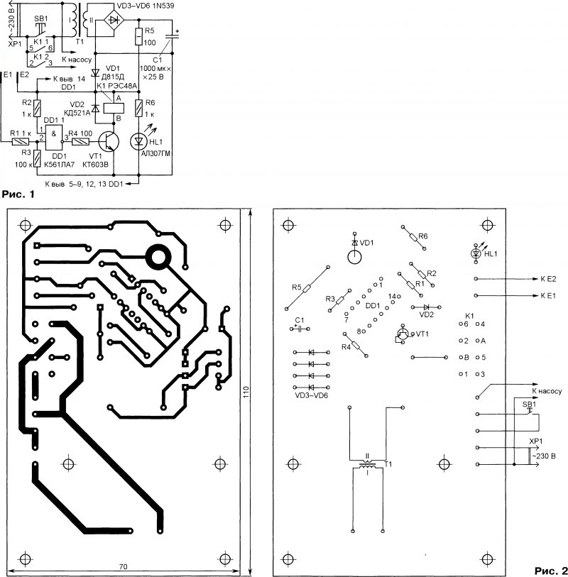 Тема: Автомат выключения насосаАвтомат выключения насоса В. АТЛАСОВ, с. Тарасово Атяшевского р-на, Мордовия При закачивании насосом воды в какую-либо ёмкость пользователь зачастую просто забывает в нужный момент его выключить, что приводит к таким неприятным последствиям, как заливание помещения водой. Предлагаемое устройство создано для решения данной проблемы. Работает оно по принципу "нажал и забыл", поэтому не нужно беспокоиться об отключении насоса от сети: когда он накачает воду в ёмкость до необходимого уровня, оно выключит его и одновременно выключится само. Схема устройства показана на рис. 1. При кратковременном нажатии на кнопку SB1 напряжение сети 230 В подаётся на первичную обмотку трансформатора Т1. В результате на его вторичной обмотке появляется пониженное напряжение около 15... 16 В, которое после выпрямления диодным мостом VD3—VD6, сглаживания конденсатором С1 и стабилизации параметрическим стабилизатором R5VD1 преобразуется в постоянное напряжение 12 В, которым питаются микросхема DD1 и обмотка реле К1. Микросхема DD1 содержит четыре логических элемента 2И-НЕ. Один из них используется в описываемом устройстве, входы остальных, в соответствии с рекомендациями по применению КМОП-мик-росхем, соединены с общим проводом. При отсутствии воды или недостаточном её уровне в ёмкости контакты Е1 и Е2 находятся в воздухе и сопротивление между ними практически равно бесконечности. Верхний (по схеме) вход (вывод 1) элемента DD1.1 через резистор R2 подключён к линии питания (+12 В), поэтому на нём поддерживается уровень лог. 1, а нижний (вывод 2) через R5 — к общему проводу, поэтому на нём присутствует лог. 0. При такой комбинации входных сигналов напряжение на выходе (вывод 3) элемента DD 1.1 имеет уровень лог. 1, поэтому после нажатия на кнопку транзистор VT1 открывается, реле К1 срабатывает и его контакты К1.1 блокируют контакты нажатой кнопки (теперь её можно отпустить), а контакты К1.2 замыкают цепь питания насоса. Когда уровень воды в ёмкости поднимется настолько, что контакты Е1 и Е2 окажутся в воде, сопротивление между ними уменьшится, уровень лог. 0 на выводе 2 DD1.1 сменится уровнем лог. 1, а такой же уровень на его выходе — уровнем лог. 0. В результате транзистор VT1 закроется, реле отпустит и его контакты отключат от сети как насос, так и само устройство. Светодиод HL1 служит для индикации работы автомата, а также (вместе с резисторами R5, R6) для разрядки конденсатора С1, чем исключается дребезг контактов реле К1 после отключения устройства. Диод VD2 защищает транзистор от противоЭДС, возникающей на обмотке реле в момент его отпускания. ![]() Чертёж печатной платы устройства и расположение деталей на ней показаны на рис. 2. Резисторы — МЯТ, С2-33, конденсатор — оксидный импортный, реле К1 — РЭС48А исполнения РС4.590.202 или РС4.590.202-01 (сопротивление обмотки — 85...115 Ом, ток срабатывания — 52 мА). Трансформатор Т1 — любой малогабаритный с вторичной обмоткой на 15... 16 В при потребляемом токе 0,2 А. Устройство не требует налаживания и при правильной сборке и исправных деталях начинает работать сразу же после первого его включения. Для понижения напряжения сети настоятельно рекомендуется применять трансформатор, это обеспечит гальваническую развязку от сети и безопасность при пользовании устройством. |