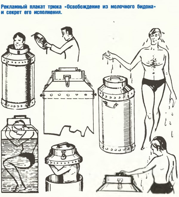 Голландия. Скованного и раздетого, его сажают в корзину, закрывают и опускают в другую, побольше размерами. Приносят новую, еще больше, еще — всего 13 корзин. Сооружение закрывают ширмой. Через 5 минут из-за ширмы появляется его голова. Но самое удивительное — корзины оказываются неповрежденными. Кандалы находят внутри самой маленькой из них.