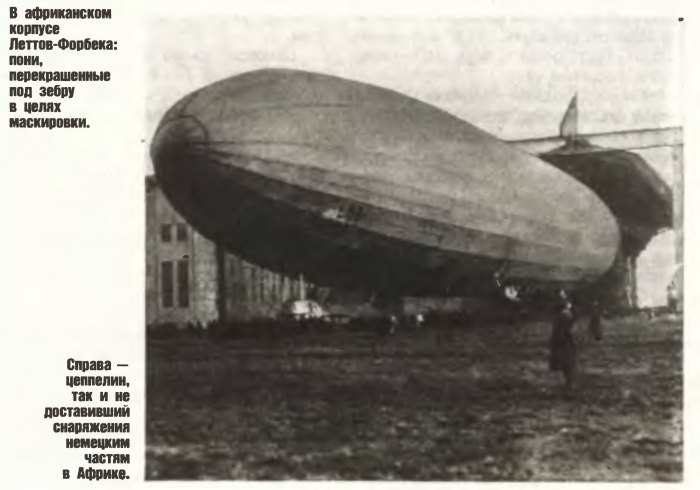 Война невидимок шла не только на море, но и на суше. Одним из ее участков стала Восточная Африка, где, несмотря на подавляющее превосходство в силах, англичанам никак не удавалось разгромить сравнительно небольшой отряд немецкого полковника Леттов-Форбека. Будучи отрезан от метрополии. этот бравый вояка тем не менее не думал сдаваться. Его тактика заключалась в непрерывных и непредсказуемых рейдах по территории Танганьики, Того и Руанда-Урунди, входивших в тогдашнюю германскую Восточную Африку Он избегал вступать в схватки с регулярными частями, заставляя союзников держать 300 тысяч солдат для охраны крупных населенных пунктов и узлов коммуникаций.