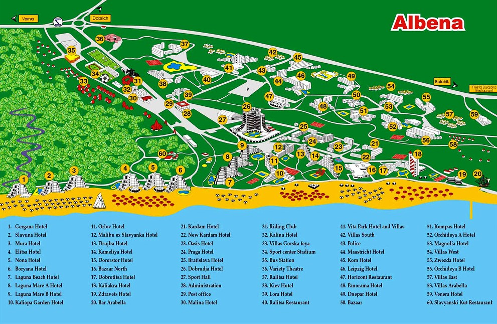 В Албене целых 43 гостиницы, где могут разместиться почти 15000 туристовю.