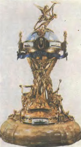 Что представляет собой кубок? На массивной подставке из оникса стоят крылатые фигуры Победы, поддерживающие земной шар. Между фигурами Победы сидят легендарный бог моря Нептун и его жена Венелия. На земном шаре Атлантический океан обозначен голубой эмалевой краской. Через него от Англии до Нью-Йорка проходит широкая красная полоса - арена борьбы судов за скорость. Земной шар окружен широким кольцом: на него уже после изготовления кубка были нанесены изображения четырех трансатлантиков: Грейт Уэстерна, гонка которого с Сириусом явилась прологом грядущих битв за почетный трофей, и трех обладателей Голубой ленты - Мавритании, Рекса и Нормандии.