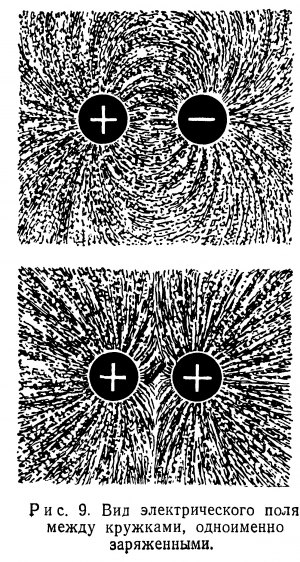 Обнаружить существование электрического поля возле заряда можно весьма простым опытом. Для этого надо наклеить на стеклянную пластинку кружочек из станиоля или фольги, наэлектризовать его и посыпать мелкими игольчатыми кристалликами гипса или хинина. Кристаллики разложатся по линиям расходящимися лучами во все стороны от заряженного кружка. Если вырезать из фольги два кружка и им сообщить электрические заряды — одному положительный, а другому отрицательный, затем на -стекло насыпать мелкие игольчатые кристаллики гипса, то под воздействием электрического поля иголочки гипса улягутся в определенном порядке; их расположение отчасти напоминает размещение железных опилок возле полюсов магнита (рис. 8). Одноименно заряженные кружки, когда их обсыпают гипсом, дадут картину электрического поля, изображенную на рисунке 9. Благодаря гипсовым кристалликам электрическое поле между двумя наэлектризованными кружками становится видимым.