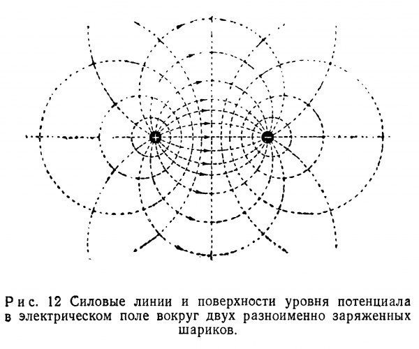 Поверхности уровня позволяют оценить величину работы, которая совершается при перемещении определенного положительного заряда из одной точки поля в другую. Для перемещения зарядов по поверхности уровня не нужно усилий, не нужна затрата работы. Переместить положительный заряд с поверхности более низкого потенциала на поверхность более высокого потенциала можно только посторонней силой, производя работу против сил поля. Обратный переход на более низкий уровень потенциала совершается силами самого поля, за счет энергии этого поля. Поле двух разноименных зарядов изображено на рисунке 12 — оно значительно сложнее, чем поле одиночного заряда, силовые линии его искривлены.