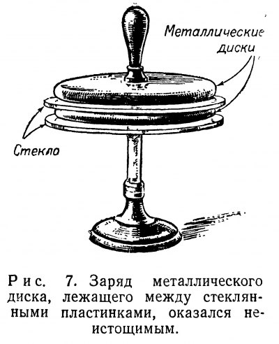 Исследователь проделал это в третий раз, в четвертый. .. Ученый носил свой круг туда и сюда, попеременно то заряжая его у диска, то разряжая в стороне. Однако заряд металлического диска, лежавшего на стеклянной пластинке, от этого нисколько не ослабел.