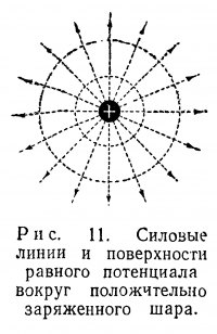 На рисунке 11 расходящиеся прямые линии показывают направления сил, действующих на положительный заряд в поле положительно заряженного шара. Эти линии называют силовыми линиями.