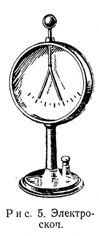 Верхний конец стержня был увенчан металлическим шариком, а с нижнего свешивались две тончайших длинных полоски из сусального золота или две ниточки, не доходившие до дна. Когда металлическому стерженьку сообщали электрический заряд, ниточки отталкивались друг от друга, сигнализируя о присутствии заряда. Такой прибор назвали электроскопом (рис. 5).