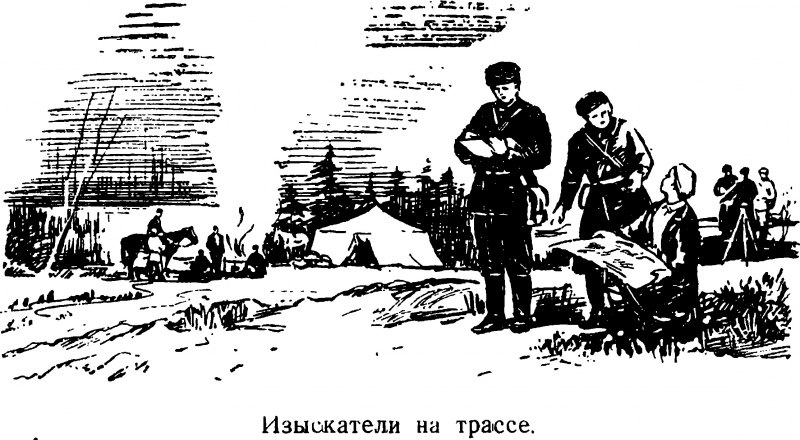 В любое’ время года инженеры выезжают на полевые изыскания. Инструменты, продовольствие, походные чертежные столы, карты, рулоны чертежной бумаги, хозяйственную утварь и парусиновые палатки доставляют к месту изысканий.