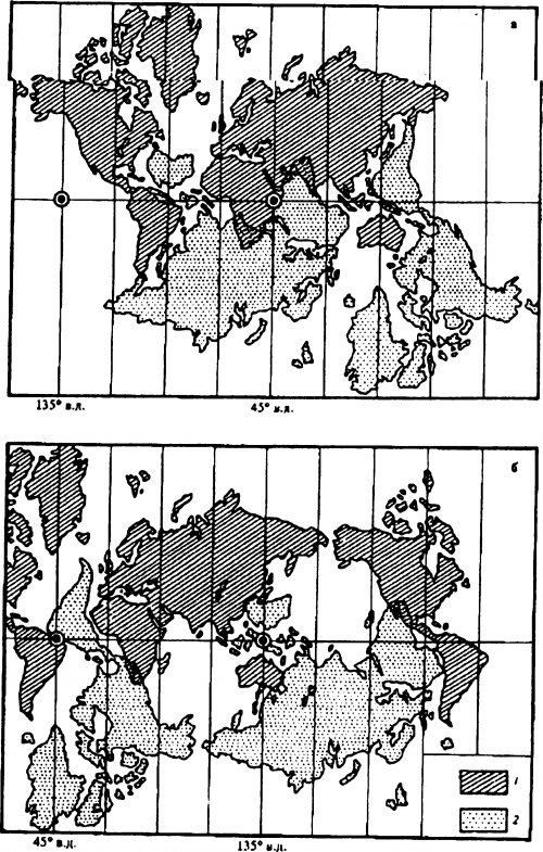 Испытание структуры поверхности Земли симметрией (по А. А. Шульге): вращение подвижной «рубашки» глобуса вокруг оси, лежащей в плоскости зкватора — а) с координатами 135* з.д. и 45* в.д., б) с координатами 45* з.д. и 135* в.д. 1 — контуры континентов на неподвижной «рубашке» глобуса; 2 — контуры континентов на подвижной «рубашке• глобуса
