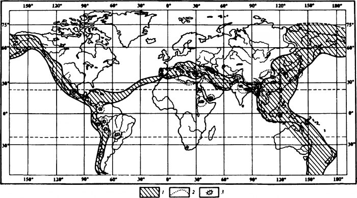 Сопоставление поясов современной тектонической активности с центром распространения культурных видов растений {по Н. И. Вавилову): 1 — подвижные пояса Земли; 2 — ареалы рас-пространения культурных видов растений; 3 — центры зарождения культурных видов растений