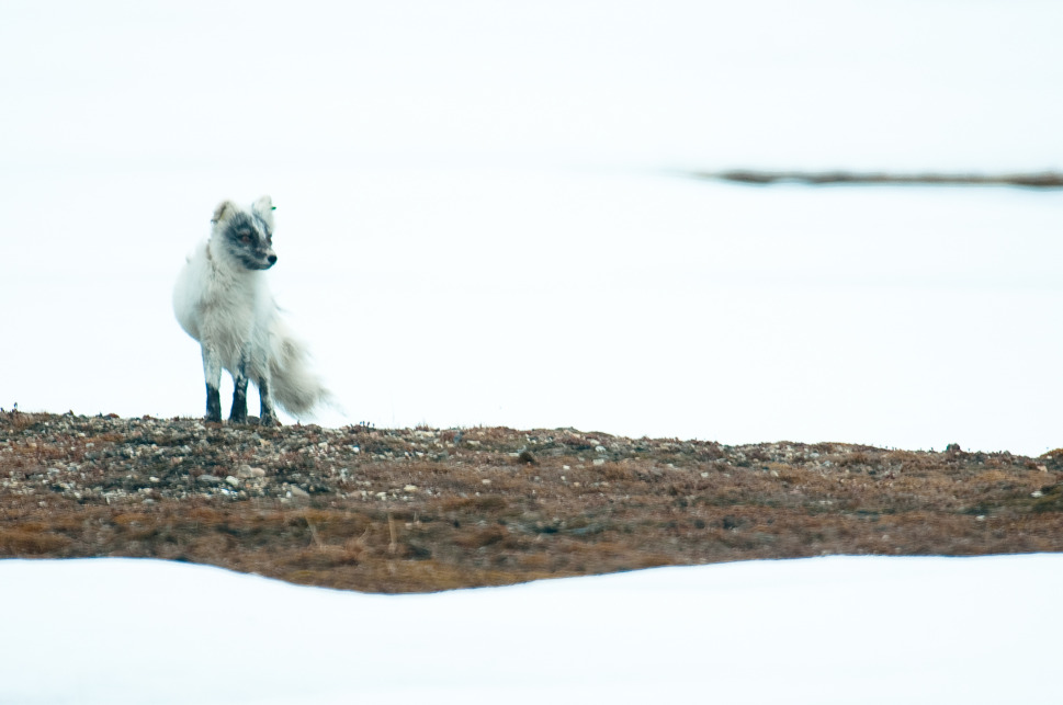 Песец стоит на обнажённой от снега земле. Поселок Ню-Олесунн, архипелаг Шпицберген