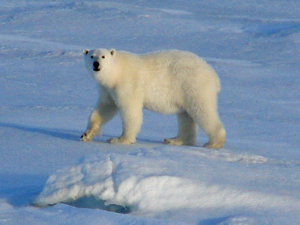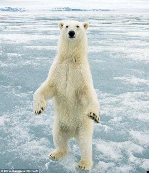 Вот любопытная самка белого медведя, королева ледяной пустыни, встала на задние лапы и смотрит на фотографа.