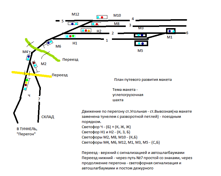 Из остатков получился очень небольшой макет, всего одна стрелка... Хочется построить нечто большее. Круговые схемы меня больше не впечетляют. Нужна мне реалистичность. И вот, придумал я вариант, как же сделать более натурально. Консольный макет, станция. Тупиковая. С нее перегон идет по макету и у другого края уходит в туннель. Туннель будет замаскирован лесом, чтобы его не было видно... Долго думая, какую бы тупиковую станцию взять, решил что шахтовую. Плюс - отсутсвтие каких-то крупных цехов и прочего, соотношение наземных сооружений и жд полотна 1/1-1/2. Погрузка угля и разгруз оборудования идут на самой станции. Сначала я открыл пособие по проэктированию жд станций промышленного типа. Но схема углепогрузочной станции оказалась слишком грамозкой. Живя все таки в угольном регионе, грех было не отправиться на подъездной путь близжайшей шахты, коей у меня является Абашевская. С нее собствено и срисована схема. Правда расположение тупиков там немного другое, и есть еще один приемо-отправочный путь, я упростил и приспособил к своим условиям схему. Получилось нечто такое [IMG] [/IMG]Вопрос в правильности расстановки светофоров и их огнях. То что до верхнего переезда - срисованное с реальной станции шахты Абашевской, на шахте светофоры расставлены по "правилам". Входной на самой шахте имеет пригласительный белый отдельной головкой и три сигнала сверху - красный и очевидно два желтых. Маневровые с выходом на главный путь - сделал с красными огнями, хотя с пути №7 на моей схеме на шахте реально стоит светофор с синим огнем (интересно почему). Выходные с путей 1 и 2 сделаны К+З+Б. Еще такой вопрос. С пути 3 и 4, являющимися погрузочными тупиками возможно ли сделать выходные светофоры или же с них нельзя отправлятся поездным порядком, а только маневровым. То есть чтобы выехать на перегон нужно сначала с пути 3 или 4 переставить маневром вагоны на путь 1 или 2 и только с него отправиться? На практике на той же Абашевской во втором парке, где была погрузка Зыряновской с погрузочного пути стоял маневровый сигнал. Федор Киселев добавил 02.02.2013 в 13:40 Честно говоря, я не знаю какая на станции установлена система, но могу сказать что перегон на промстанцию Байдаевка с промстанции Абашевская оснащен автоблокировкой без проходных светофоров как никак. На станции Абашевская 7 централизованных стрелок. Думаю раздельный перевод, раздельное управление сигналами. Особо с пультом заморачиваться не хочу, хотелось бы чтобы он был похожий. Конечно, на нем будут функции, присущие только макету - например включение питания, вольтметр напряжения и амперметр тока, модель контроллера для управления движением локомотива и т.п. Самый сложный вопрос - определение свободности путей. Так как по ним идет тяговое напряжение на колеса модели... ________________________________________ Конкретно. Примерное мое решение схемы включения входного светофора. Будем исходить из того, что принять поезд можно только на "поездные" пути, то есть те, с которых есть выходные светофоры. У меня их два - 1 и 2. При нажатии кнопки "открытие входного сигнала" подается питание на включение самозапитывающегося реле. Оно уже подает подает напряжение на блок проверки положения стрелок(не установлены ли стрелки по маршруту на пути 7 и 3,4) и на блок проверки свободности пути. Со стрелками все просто - реле. А вот со свободностью пути нет.