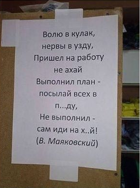 а я на них срал! стране нужны паровозы, нам нужен металл! товарищ! не охай, не ахай! не дёргай узду! коль выполнил план, посылай всех в п*зду не выполнил - сам иди на х*й. (В.Маяковский) Так дословнее. :) И про паровозы. |