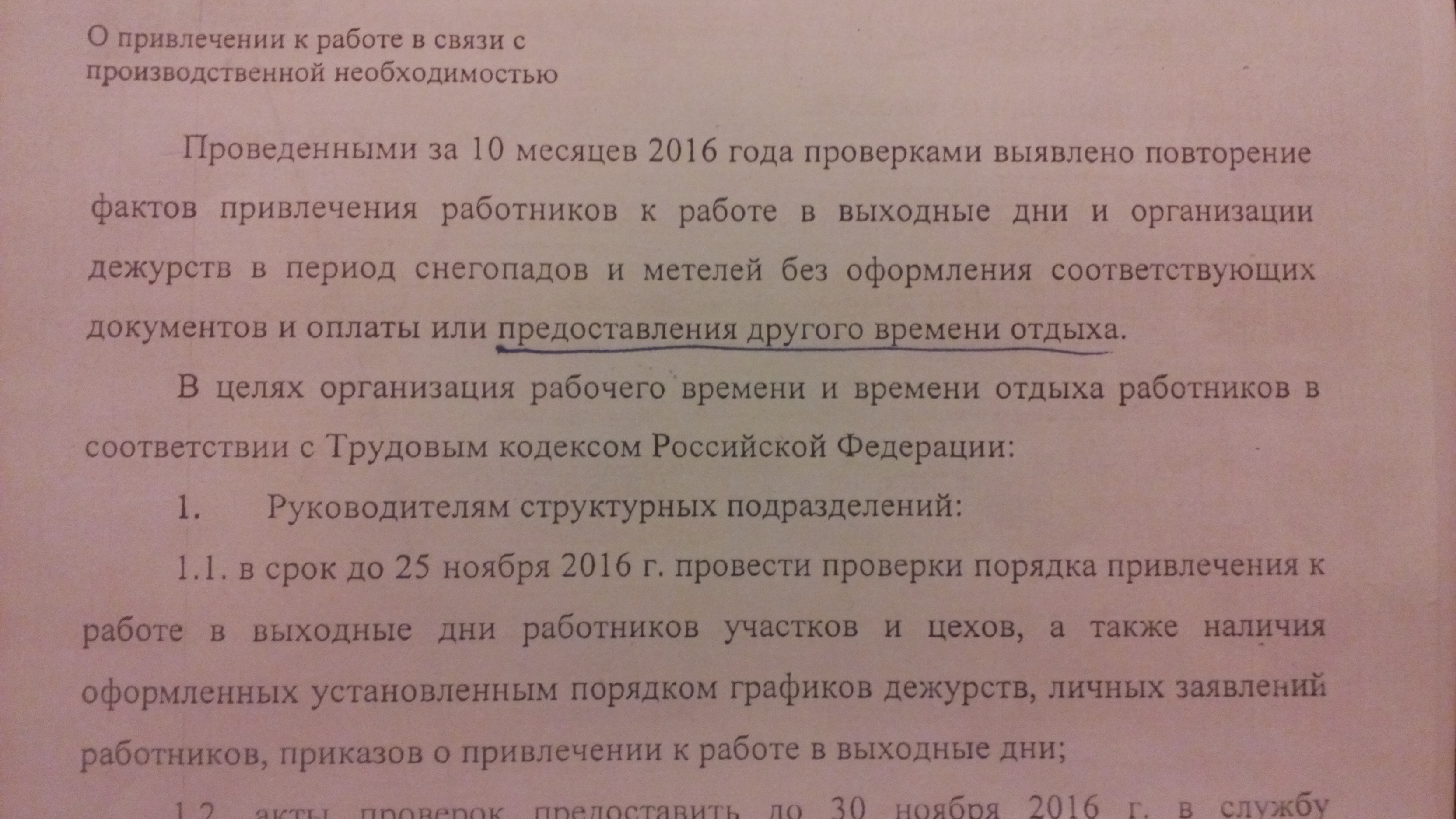 С целью недопущения фактов привлечения работников дистанции к работе в нерабочее время и организации дежурства в период снегопадов и метелей, а также с целью устранения отказов технических средств, предотказных состояний без оформления соответствующих документов и оплаты или предоставления другого времени отдыха приказываю: 1. Привлекать работников дистанции к работе в нерабочее время в связи с производственной необходимостью в соответствии с графиком дежурства, утвержденным начальником дистанции. Привлечение к работе производить с их письменного согласия с предоставлением другого времени отдыха. 2. Старшим эл.механикам разработать и предоставить на утверждение начальнику дистанции графики дежурства работников бригады. 3. Инженеру ОТиЗ установить контроль за организацией рабочего времени и времени отдыха работников, привлекаемых к работе в нерабочее время в соответствии с Трудовым кодексом Российской Федерации. 4. Контроль возложить на ведущего специалиста по управлению персоналом. ШЧ Кто хочет что-то добавить, какие статьи ТК РФ во вступлении обозначить, какие-то приказные пункты? Давайте вместе родим приказ. |