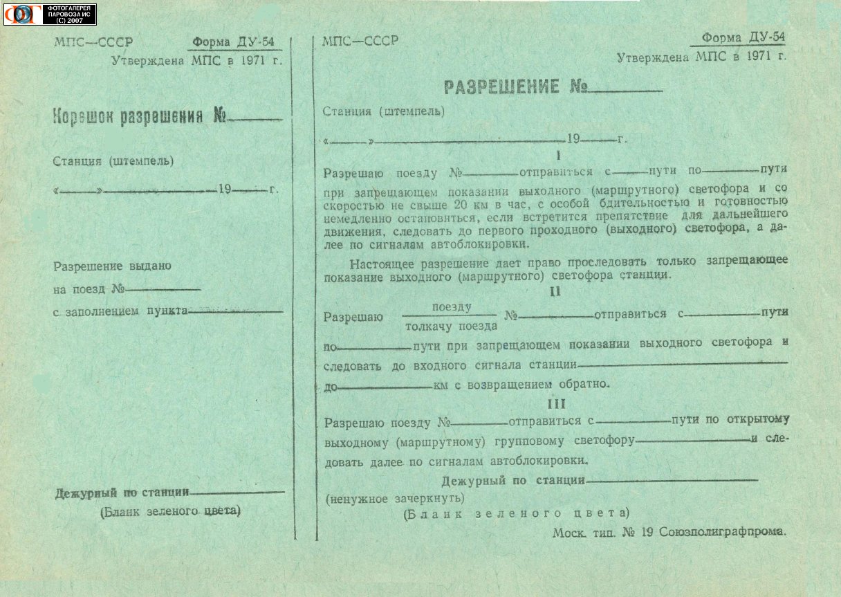 1) По регистрируемому приказу ДСП, передаваемому по радиосвязи. 2) По регистрируемому приказу ДСП, передаваемому по спец. телефону, установленному у входного светофора 3)По пригласительному 4)По письменному разрешению ДСП * 5)По регистрируемому приказу ДСП, при ДЦ. 6)По спец маневровому светофору. * Письменного разрешение на прием поезда при запрещающем показание входного светофора установленной формы НЕ СУЩЕСТВУЕТ т.к. оно очень редко используется, ведь легче дать приказ, но при необходимости ДСП пишет разрешение собственной рукой без определенной установленной формы.А ДУ 54 Для выходного... Последний раз редактировалось НикитаС; 17.01.2015 в 19:09. |