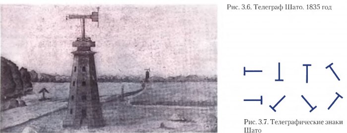 Тема: Оптические и электрические телеграфыОптические и электрические телеграфы Начиная с древних времен люди придумывали различные способы передачи информации, и как правило, эта информация носила срочный характер. Так, в Древней Руси при набегах татар применялась огневая и дымовая сигнализация с помощью горящих снопов на шестах, поднимаемых с курганов, отстоящих друг от друга на несколько верст. Необходимо обратить внимание читателя, что в описываемый период времени трудно было различить средства связи от средств сигнализации. И в последующие периоды сигнализация и связь были очень схожими не только по назначению, но и по своей элементной базе. Изобретение зрительных труб позволило значительно расширить действия оптической сигнализации. Появились системы, сигнальные приборы, с помощью которых можно было передавать различные извещения и распоряжения. Так, появился семафорный телеграф с передвижными крыльями. В XVIII веке различные изобретатели предлагали различные системы оптического телеграфа. Но только Клод Шапп довел свое изобретение до внедрения. В 1791—1795 годах К. Шапп со своими братьями разработал оптический телеграф (рис. 3.1). Примеры различных положений крыльев семафора Шаппа показаны на рис. 3.2. В этот период было введено слово «семафор», означающее носитель знаков. ![]() Для передачи информации в телеграфе Шаппа применялась система шифрования слогов, слов и фраз посредством цифр и букв. Первый телеграфный код Шаппа заключал 8460 слов, размещенных на 92 страницах. Сигналы подавались два раза, причем первый обозначал помер страницы, а второй — номер слова на этой странице. Впервые телеграф Шаппа был продемонстрирован 30 августа 1794 года, когда была передана депеша о победе войск французского конвента над австрийцами и обратно — приветствие от конвента Северной Армии. Именно в этот период было введено слово «семафор», означающее носитель знаков. В конце того же 1794 года выдающийся русский изобретатель И.П. Кулибин разработал первый отечественный оптический телеграф, сигналы которого были подобны сигналам телеграфа 5ратьев Шапп, но привод для управления крыльями И.II. Кулибин разработал самостоятельно. Принцип его работы показан на рис. 3.3. ![]() Каждое из крыльев может занимать восемь положений по отношению к регулятору. ![]() Все рукоятки могут закрепляться в соответствующих положениях. По приведении крыльев в необходимое положение с помощью рукоятки Рз устанавливают регулятор. Положение управляющих рукояток па мачте прибора совпадает с передаваемым сигнальным показанием (рис. 3.4), что облегчало сигналисту проверку правильности передачи. Модель оптического телеграфа Кулибина, изготовленная в мастерских Академии Наук, была передана в Кунсткамеру в кабинет Петра I. Разработанный И.П. Кулибиным телеграфный код состоял из одной таблицы, передача слова велась по частям по однозначным и двухзначным слогам («одинокие» и «двойные» склады). ![]() Изобретение Кулибина не было по достоинству оценено. Когда возникла необходимость при Николае I в оптических телеграфах, то обратились к французам. Хотелось бы обратить внимание читателей еще на одно малоизвестное изобретение Кулибина. Это прожекторный фонарь, изобретенный им в 1779 году. В нем была применена система отражательных зеркал, что давало возможность в значительной мере и