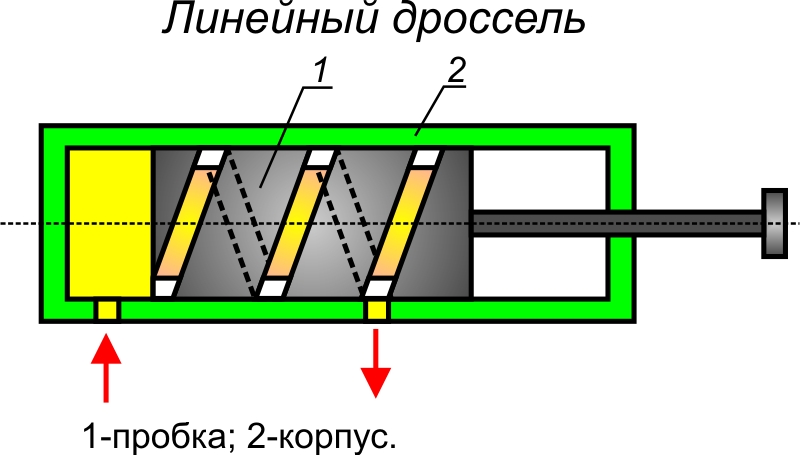Основной характеристикой гидродросселя является зависимость расхода от перепада давлений в подводимом и отводимом потоках. По виду данной зависимости они делятся на линейные и нелинейные. Линейными называются гидродроссели, в которых снижение давления, пропорционально расходу в первой степени. Данная зависимость имеет место тогда, когда в дросселе устанавливается ламинарный режим движения жидкости. Примером линейного дросселя является винтовой регулируемый дроссель, представленный на рисунке.