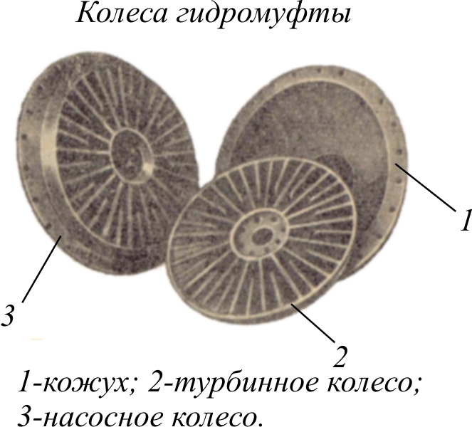 Гидромуфта (гидродинамическая муфта) состоит из центробежного на-соса и гидравлической турбины с предельно сближенными и размещенными в одном круге лопастными системами. На ведущем валу 7 гидромуфты укреплено колесо центробежного насоса (насосное колесо) 1, а на ведомом 5 колесо турбины 3 (турбинное колесо). С насосным колесом скреплен кожух 4, охватывающий колесо турбины. Входные и выходные кромки лопастей насосного колеса располагаются в непосредственной близости к выходным и входным кромкам лопастей турбинного колеса с зазором, необходимым для обеспечения свободного вращения и теплового расширения колес.