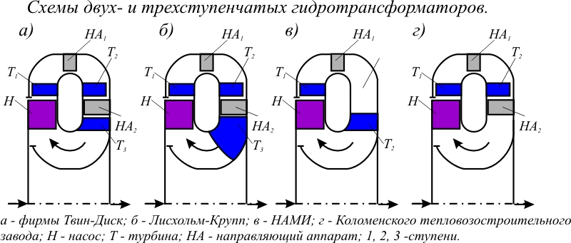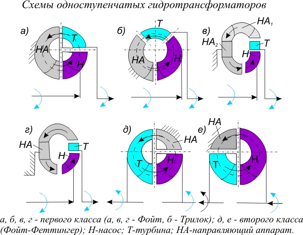 Гидротрансформаторы с тремя колесами (насосным, турбинным и колесом направяющего аппарата) называют одноступенчатыми. На рисунке показаны наиболее часто применяемые схемы расположения колес в круге циркуляции одноступенчатых гидротрансформаторов.