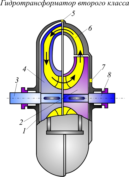 Гидротрансформатор представляет собой конструкцию, состоящую из насосного колеса 2, турбинного колеса 4 и направляющего аппарата 6. Взаимное расположение насосного, турбинного колес и направляющего аппарата может быть различным. Направляющий аппарат размещают либо за турбинным колесом - гидротрасформатор первого класса; либо за насосным - гидротрансформатор второго класса.