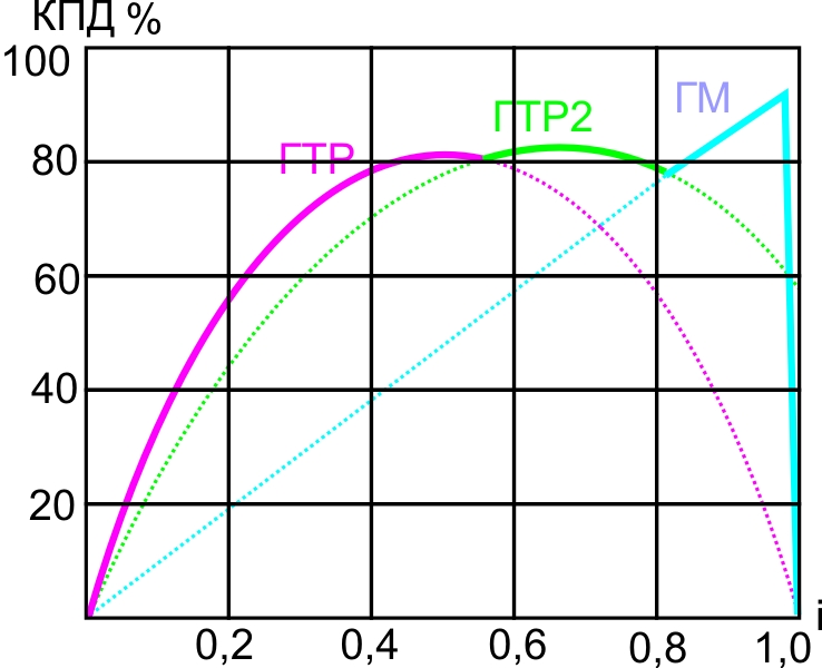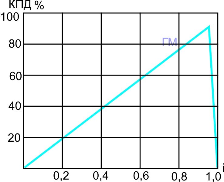 Рассмотрим зависимость к.п.д.гидромуфты и гидротрансформатора от их передаточного отношения, приведенные на рисунках.
