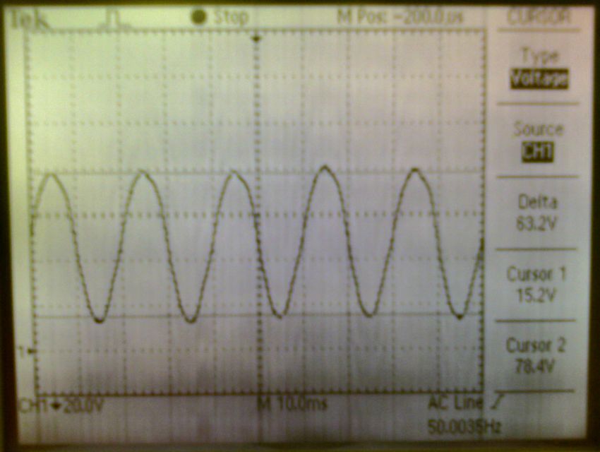 6.2. Измерения производились в линейной цепи, запитанной от двух последовательно включенных источников постоянного напряжения БПШ, с суммарным напряжением 80 В. Уровень пульсаций при подключенной нагрузке составляет 8 В.