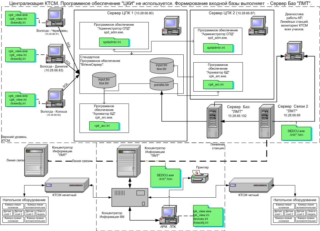 ![]() Выкладывайте нет проблем! Просто инженер АиТ добавил 30.01.2013 в 09:11 А Зингер М.Б. вчера был в Москве. А по техническим вопросам может ответить и Просто инженер. Просто инженер АиТ добавил 30.01.2013 в 10:04 Уважаемый Николай Николаевич! А видели ли вы документ написанный ещё 2003 г. после того, как, тогда ещё "Лаборатория микропроцессорной техники" реализовала свою централизацию КТСМ, по причине отсутствия каналов связи для построения СПД АСК ПС по стандартной схеме. В этом документе есть ответы на многие вопросы, которые сейчас появились. Три года мы честно поддерживали централизацию, пока не появились каналы связи. КТСМам считаю необходимым придать статус системы отвечающей за безопасность движения и системы реального времени, а отсюда сразу же появятся реальные требования. Кроме того, я бы КТСМ увязал с АБ и ЭЦ станции, так как например, увязывают УКСПСы и дополнил её системой "Пальма" для возможности индентифицировать сразу номер больного вагона. Технически это сделать можно без особых проблем. Правда сертификация потебует материальных затрат. А если систему "Пальма" слегка переделать, то её можно размещать на опоре контактной сети. ![]() Просто инженер АиТ добавил 30.01.2013 в 16:56 Хочу вставить пару картинок как у нас было. Просто инженер АиТ добавил 30.01.2013 в 16:59 ![]() ![]() Просто инженер АиТ добавил 31.01.2013 в 09:44 Как видно из картинок вроде ничего сложного , но вот только пару моментов омрачают ситуацию:![]() 1 - нельзя потерять ни одного сообщения; 2 - доставить нужно хотя бы за 5 секунд. ![]() И из за этих моментов ПО перестаёт, казаться, простым. Для многих систем ТС/ТУ (АСДК, ДЦ, СДУМ и т.д.) первый момент не так критичин, т.к. опрос происходит циклично и потеря одного сообщения даже не будет видна в АРМе. Но совсем другое дело в централизации КТСМов, потеря одного сообщения может привети к потери больного вагона!!! ![]() Просто инженер АиТ добавил 31.01.2013 в 10:09 То, что показано на картинках - это только одна часть функций, которые поддерживал Концентратор Информации ЛМТ (КИ ЛМТ). КИ ЛМТ выполнял следующие функции: 1 поддержка СПД любой архитектуры с возможностью объединения и расщепления информационных потоков с контролем доставки сообщений. Обмен по физическим линиям связи (линии связи как правило выделяли самые отвратительные, по которым телефон, то не мог толком работать), по каналам ВЧ (поддерживалось до 18 модемов на один КИ и 16 СОМ портов), по UDP/TCP соединениям; 2 Съём дискретных сигналов с предварительной обработкой (собственные модули съёма с лампочек пульт-табло, ПИК120) (количество сигналов практически не ограничено); 3 Съём аналоговых сигналов ПИК-10; 4 Стыковка с аппаратурой ДИСК на нижнем уровне и централизация; 5 Стыковка с КТСМ на уровне станций; 6 Централизация КТСМ; 7 Стыковка с системой "Пальма" на уровне НСУ; 8 Централизация системы "Пальма" и обмен с АСУ: 9 Сервер Баз данных; 10 Web сервер (АСДК, КТСМ, "Пальма"). Ещё так по мелочи. Всё ПО+Linux помещалось на "Disk-on-chip" размером в 32 метра и могло работать на IBM подобной машине с 386 процессором и выше. ПО без изменения исходных текстов могло работать под: DOS 6.22, QNX 4.25, Linux, Windows при этом загруженность процессора была ниже 1%. Просто инженер АиТ добавил 31.01.2013 в 10:35 ПО представляло из себя трансфомер, при запуске ПО конфигурировалось согласно файлам инициализации, поэтому загрузочный модуль был всегда один и тот же, что для станции, ч