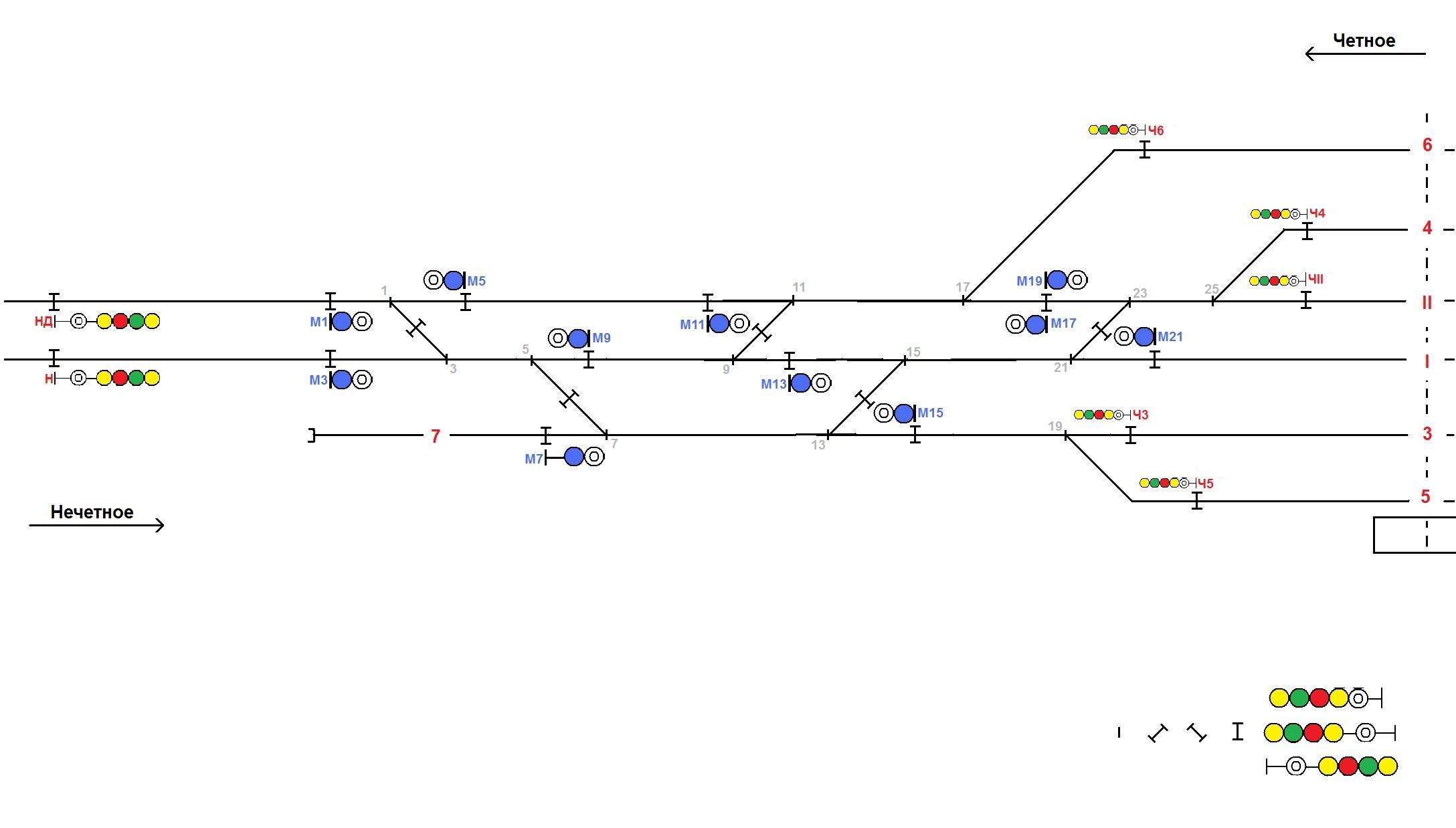 Ну на первый взгляд, напрашивается бесстрелочная секция между стрелками 1 и 11 и соответственно маневровый светофор перед 11 стрелкой.