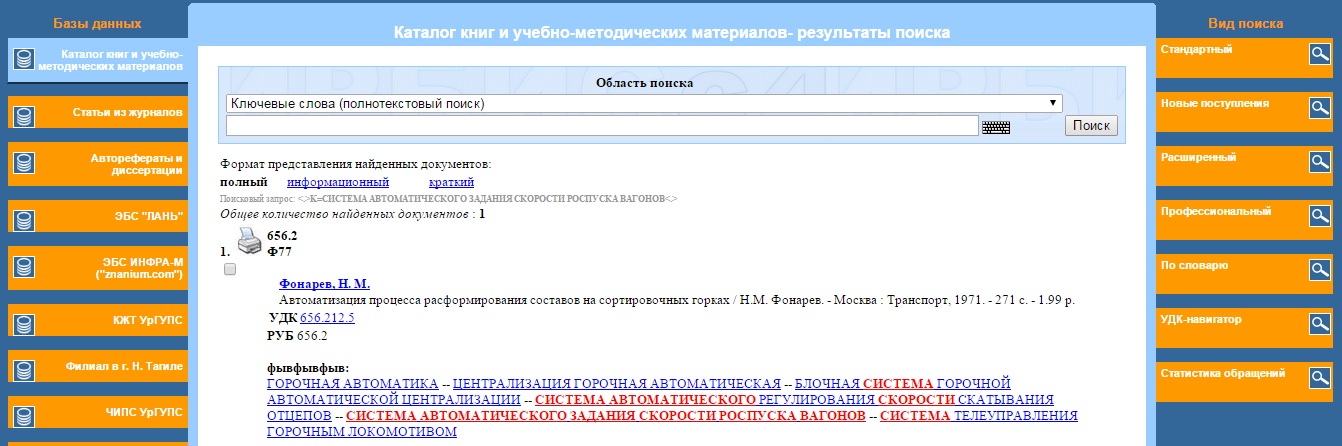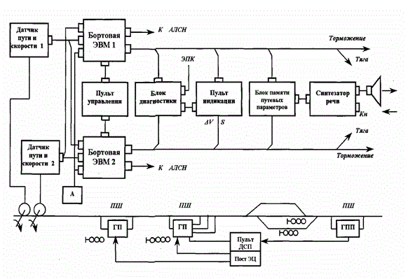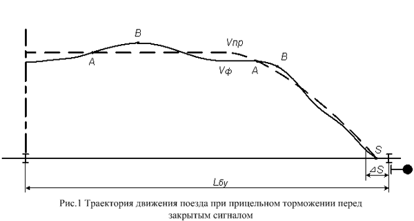 Вот еще пример. Система автоматического управления тормозами (САУТ) Принцип действия САУТ На сегодняшний день система АЛСН является наиболее распространенным средством, которое обеспечивает условия безопасности движения поездов. Хотя аппаратура АЛСН исключают проезд сигнала с запрещающим показанием, но экстренное торможение поезда при АЛСН происходит только после проезда этого светофора (запрещающего). Да и само по себе применение экстренного торможения влечет за собой значительные негативные последствия: значительные нагрузки на ПС, вследствие ударных механических воздействий; возможность травмирования пассажиров и т.д. Еще один значительный "минус" АЛСН – это невозможность контролировать снижение скорости поезда в местах, где действуют ограничения. И поэтому выбор скоростного режима в таких условиях возлагается на машиниста. Но не зависимо оттого, что машинист имеет определённые знания и большой опыт работы, не исключены ошибки, которые он может допустить при управлении поездом. При возникновении таких ошибок условия безопасности движения поездов выполняться не будут, так как аппаратура АЛСН не может предотвратить последствий ошибок машиниста, которые связаны с потерей бдительности, поздним включением тормозов, не точным определением расстояния до впереди стоящего светофора или по причине неправильного прогнозирования траектории движения поезда. Все это говорит о необходимости применения систем автоматического управления движением поездов и в первую очередь – системы автоматического управления тормозами (САУТ). При этом необходимо исключить проезд сигналов с запрещающим показанием путём прицельного торможения с плавным регулированием скорости движения поезда во всем диапазоне – от максимальной до нулевой. На рисунке 1 изображена траектория движения поезда при прицельном торможении перед закрытым сигналом. ![]() Траектория движения поезда при прицельном торможении перед закрытым сигналом На основании информации о профиле пути, длине блок-участка Lбу и тормозных характеристик поезда система САУТ определяет max-но допустимую программную скорость движения поезда Vпр. Во время следования поезда САУТ производит измерение фактической скорости Vф, сравнивает ее с программной скоростью и в случае необходимости воздействует на тормозные и тяговые средства поезда. Для наглядности изложения, рассмотрим в упрощенном виде процессы воздействия элементов САУТ на тормозные и тяговые средства поезда в движении. На рис. 1 изображены траектории, показывающие движение поезда по блок-участку. Программная траектория движения показана пунктирной линией, а фактическая траектория – сплошной линией. Из графика видно, что если фактическая скорость на блок-участке меньше программной (Vф < Vпр), то система САУТ никак не воздействует на процесс ведения поезда. Допустим, из-за сложившейся поездной ситуации машинист начинает увеличивать скорость Vф и её величина станет приближаться к значению программной скорости Vпр. Когда Vф достигнет значения (Vпр-2) км/ч, на графика это точка "А" (рис. 1), исполнительными элементами САУТ отключится тяга локомотива. Если же, например, на спуске, скорость поезда будет продолжать увеличиваться и начнет превышать программную, то при значении Vф = (Vпр+2) км/ч, на графике это тока "В", исполнительным