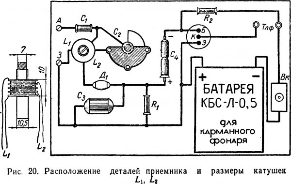 На рис. 19 приведена схема приемника 0-V-1. Это детекторный приемник с одним каскадом усиления низкой частоты, простейший транзисторный приемник всего на одном транзисторе. Такой приемник имеет низкую чувствительность и не может дать достаточного усиления сигнала. В этом случае необходима не магнитная, а наружная антенна, подвешенная на высоте 10—15 м над землей (чем выше, тем лучше), и хорошее заземление. От наружной антенны можно получить больший уровень сигнала, чем от магнитной. Таким образом, недостаточная чувствительность приемника компенсируется большим уровнем подводимого сигнала. Остановимся на его схеме несколько подробнее. На наружную антенну А воздействуют сигналы многих радиостанций, работающих на различных частотах радиовещательного диапазона. Эти сигналы через конденсатор C1 поступают в колебательный контур L\С2, настроенный с помощью конденсатора переменной емкости С2 на частоту интересующей нас радиостанции. Для такой частоты в колебательном контуре создаются условия резонанса, т. е. собственная частота контура становится равной частоте принимаемого сигнала. При резонансе амплитуда этого сигнала в контуре во много раз больше сигналов других частот. Протекая по катушке L\, ток сигнала создает вокруг нее переменное магнитное поле, которое охватывает и катушку L2, являющуюся катушкой связи входного контура Z-|C2 с детекторным каскадом. Вместе обе катушки образуют трансформатор ВЧ. Энергия сигнала из катушки L\ передается в катушку L2. Такой способ передачи энергии и связи между катушками называется индуктивным. С катушки L2 сигнал поступает в детекторный каскад, включающий в себя эту же катушку, диод сопротивление R\, конденсаторы С3С4 и входное сопротивление транзистора Тх (сопротивление перехода эмиттер — база). ![]() Процесс детектирования заключается в том, что колебания высокой частоты, модулированные по амплитуде колебаниями звуковой частоты, выпрямляются диодом Д1, преобразуются в пульсирующий ток, содержащий три компонента: постоянную составляющую, переменную составляющую высокой частоты и переменную составляющую низкой или звуковой частоты. Из них интерес представляет только составляющая низкой частоты. Высокочастотная составляющая может оказаться даже источником помех радиоприему, поэтому ее кратчайшим путем замыкают на корпус приемника (с помощью конденсатора С3). Цепь тока постоянной составляющей замыкается через сопротивление Rь Другого пути нет, так как конденсаторы С3 и С4 постоянного тока не пропускают. Частота высокочастотной составляющей равна частоте сигнала принятой радиостанции, например, 1000 кгц (средневолновой диапазон 300 м). Для тока частоты 1000 кгц сопротивление R\ такое же, как и для постоянного тока (10 ком), сопротивление конденсатора С3— около 16 ом, а общее сопротивление конденсатора С4 и перехода эмиттер — база транзистора Т\ 700 ом. Поэтому путь тока лежит через конденсатор С3, т. е. через наименьшее сопротивление. Для составляющей звуковой частоты (допустим 1000 гц) R\ такое же, как и всех прочих частот,— 10 ком, конденсатора С3—около 16 ком. Общее сопротивление конденсатора С4 и входной цепи транзистора Т\ немногим больше 700 ом. Таким образом, ток звуковой частоты проходит через транзистор ТСледовательно, нагрузкой детекторного каскада по звуковой частоте служит входное сопротивление тр