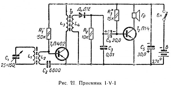 Тема: Приемник по схеме 1-V-1Приемник по схеме 1-V-1 На рис. 21 приведена схема трехкаскадного приемника прямого усиления, собранного на двух транзисторах и одном диоде. Он имеет каскад усиления высокой частоты, детекторный каскад и каскад усиления низкой частоты. Такой приемник более чувствителен по сравнению с ранее описанным и может принимать местные радиостанции на внутреннюю магнитную антенну. Сигнал радиостанции принимается магнитной антенной, находящейся внутри приемника. Катушка L\ магнитной антенны и конденсатор переменной емкости С\ образуют входной колебательный контур, из которого сигнал поступает на катушку связи а затем на базу транзистора Т\ (усилителя высокой частоты), где и усиливается. Усиленный сигнал с нагрузки каскада катушки Ц высокочастотного трансформатора Тр поступает в индуктивно связанную с ней катушку L4, а затем на детектор Д\. Нагрузкой детектора по звуковой частоте служит входное сопротивление транзистора 7Y Сигнал усиливается и воспроизводится громкоговорителем Гр. ![]() В отличие от предыдущей эта схема имеет каскад усиления высокой частоты на транзисторе Т\, магнитную антенну и громкоговоритель. В остальном же они аналогичны, поэтому здесь мы рассмотрим только особенности этой схемы. Каскад УВЧ предназначен для усиления высокочастотного сигнала и передачи его в детекторную цепь с повышенным уровнем энергии. Поэтому даже слабые сигналы радиостанций, которые не может принять детекторный приемник, будут приняты приемником, имеющим УВЧ Высокочастотный сигнал из катушки L\ магнитной антенны поступает через катушку связи L2 на вход транзистора Т\ для усиления. Сопротивление R\ служит для установления необходимого смешения на базе транзистора по постоянному току. Оно аналогично сопротивлению /?2 предыдущей схемы. Конденсатор С2 является разделительным, так как отделяет цепь постоянного тока от цепи переменного. В противном случае на базе транзистора не было бы смещения, так как цепь смещения замкнулась бы на батарею через катушку L2. Нагрузкой транзистора Т\ служит первичная обмотка Ц высокочастотного трансформатора Тр. Применение в приемнике вместо телефонных наушников громкоговорителя не вносит никаких существенных' изменений в схему УНЧ. Электролитический конденсатор С5 блокирует батарею питания от токов высокой и низкой частоты, которые, проходя через батарею, могли бы вызывать самовозбуждение приемника, что проявляется в виде свиста, гудения и других неприятных явлений. В предыдущем приемнике такого конденсатора не было, поскольку самовозбуждение в нем маловероятно. |