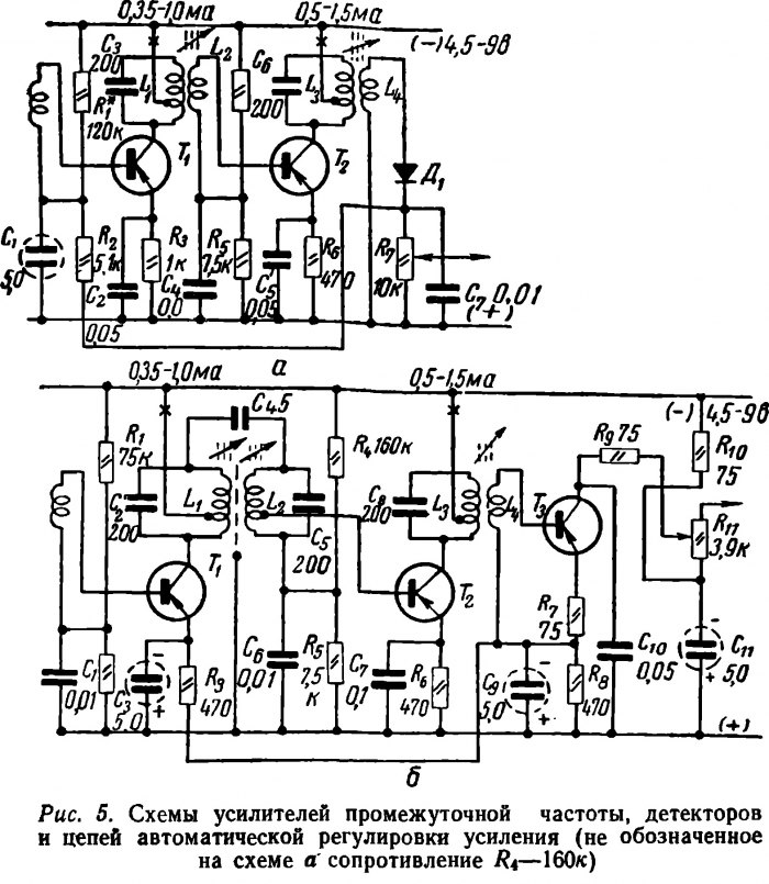Тема: Каскады усиления промежуточной частоты, детекторы и цепи автоматической регулировки усиленияКаскады усиления промежуточной частоты, детекторы и цепи автоматической регулировки усиления Немаловажную роль в супергетеродинных приемниках играют каскады усилителей промежуточной частоты. Они обеспечивают необходимое усиление по высокочастотному тракту и избирательность приемника по соседнему каналу. Кроме того, в этих каскадах осуществляется автоматическая регулировка усиления. Несмотря на столь ответственные функции, каскады усиления промежуточной частоты сравнительно просты в схемах и налаживании. Существующие разновидности схем различаются лишь по конструктивному выполнению нагрузок. Большое распространение получили одиночные контуры. Вызвано это в основном простотой их настройки, произвести которую можно без специальных измерительных приборов. Полосовые фильтры встречаются очень редко и обычно в сложных приемниках промышленного изготовления. В последнее время появилась новая разновидность нагрузки — многоконтурный фильтр сосредоточенной селекции, обеспечивающий высокую избирательность приемника по соседнему каналу. По сложности налаживания он аналогичен полосовому фильтру и пока довольно редко применяется радиолюбителями. Часто в радиолитературе встречаются схемы каскадов усилителей с нейтрализацией нежелательной внутренней проводимости в транзисторах. Применение нейтрализации позволяет получить несколько более устойчивое усиление транзистора, нежели без нее, но это очень кропотливая, трудоемкая работа. Использование в усилителях современных транзисторов П15, П401— П403 и правильный выбор их режимов практически гарантируют хорошую работу каскадов промежуточной частоты без применения нейтрализации. Прибегать к ее помощи нужно лишь в случаях использования транзисторов с-низкой граничной частотой. ![]() Неотъемлемой частью усилителей промежуточной частоты являются детекторы и цепи автоматической регулировки усиления. Детекторы обычно выполняют на полупроводниковых диодах и реже на транзисторах, которые, кроме детектирования, одновременно и усиливают преобразованный сигнал. Наибольшее предпочтение отдается диодным детекторам, потому что они имеют очень простые схемы и не требуют никакого налаживания. Этого нельзя сказать о транзисторных детекторах. Схемы их значительно сложнее, имеют большое число деталей и требуют тщательного подбора режима работы транзистора. Если не выполнено последнее условие, то транзистор одинаково плохо работает и как детектор, и как низкочастотный усилитель. Почти во всех супергетеродинных приемниках применяются цепи автоматической регулировки усиления, устраняющие перегрузку отдельных каскадов при настройке приемника на мощные местные станции. Обычно в схемном решении цепи регулирования просты и практически не требуют налаживания. Два варианта схем усилителей промежуточной частоты показаны на рис. 5. В варианте рис. 5,а схема выполнена на одиночных контурах с детектором на полупроводниковом диоде. Автоматическая регулировка усиления осуществляется по цепи базы транзистора Тг. В варианте рис. 5, б в первом каскаде применен двухзвенный фильтр сосредоточенной селекции, во втором — одиночный контур. Детектор выполнен на транзисторе. Автоматиче