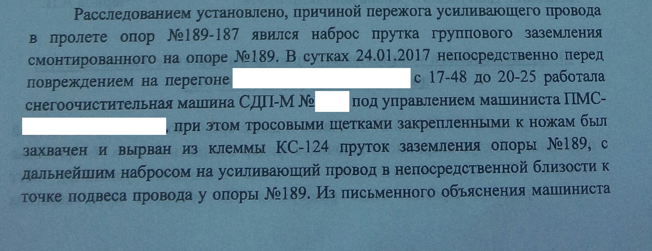 Приветствую всех. Никогда не был на таких форумах, но видимо пришло мое время обратиться. Расскажу свою историю. Я машинист снегоуборочной машины СДП-М следовал по перегону с работой. Впереди меня едет электровоз тянет меня (в нем находится руководитель работ представитель ПЧ) следом СДП-М, тепловоз, ПОМ (ветерок).... на одном из километров я увидел небольшую вспышку справа по ходу движения, спросил у электровоза и тепловоза видели или нет, ответ последовал положительный, спросил все ли в порядке у них и следуем далее с работой или нет, ответ так же был положительным. Через 10-15-20 км не помню точно прибыли на станцию, работа была закончена. В мои обязанности входило опускать и поднимать щит с щетками, по указанию руководителя работ (находился в кабине электровоза и сообщал мне действия по рации). Примерно через три часа сообщили, что при работе мною было оторвано заземление и произошел пережег усиливающего провода. Расстояние от шпалы до щеток составляет 100 мм у правого рельса по ходу движения, к концу шпалы расстояние 140 мм, расстояние щеток от рельса в сторону откоса составляет 60 мм. Подскажите пожалуйста какие правильные мои действия должны были быть в этой ситуации, на какой высоте, в каких габаритах должно быть расположено заземление.