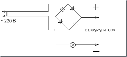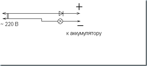 зарядное устройство без трансформатора: ВНИМАНИЕ !!! Опасность поражения электрическим током. Диод должен иметь обратное напряжение не менее 400 вольт, а ток — более 2 ампер , например Д233, Д246,КД203,ДЛ112 и т.п., а лампочка – 220В, мощностью от 100 до 200 Вт. Зарядный ток такого устройства приблизительно 0,2-0,5 А. Для его увеличения следует использовать чуть более сложную схему: В этом случае ток зарядки увеличится до 1А. Для того. чтобы получить еще большее значение можно использовать электролампу (или любой бытовой прибор) мощностью 500…1000 Вт, в таком случае зарядный ток составит 2…4 А. Последний раз редактировалось Balbes; 03.01.2013 в 19:50. |